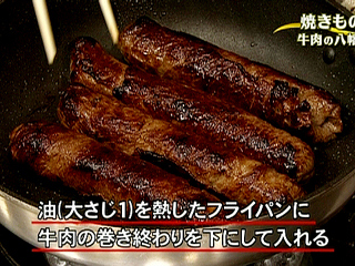 八幡巻きの調味料をしっかり煮つめてからめること。
