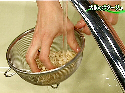 切り干し大根はさっと洗って、ザルにおいて水気をきり最小限の水でもどすこと(長く水につけたりしないこと)。