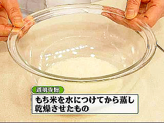 もち米を水につけて蒸し、乾燥させてひいたもの。写真は「4割大粒」と呼ばれるもので、もち米1粒を4つに割ったもの。さらに細かくひいた粉もある。