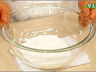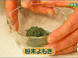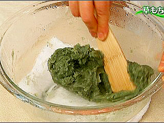 早春のやわらかい葉を摘み、ゆでて乾燥させ、粉末にしたもの。湯でふやかしてから生地に混ぜ込む。