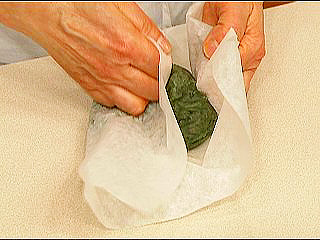 (3)やわらかくなったら、オーブンペーパーの上にのせて、さらにもむ。