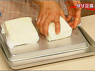 豆腐は重石をして1時間おいて水きり。割ってみて中から水分がにじみ出ない状態になるまでしっかり水きりする。