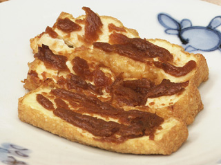 材料:4人分 厚揚げ・・・2枚(300g) ピーナッツバター(加糖)・・・大さじ3 砂糖・・・小さじ2 しょうゆ・・・小さじ1+1/2 水・・・大さじ1+1/2 作り方 (1)厚揚げは軽く表面の油をふきとり、1cm厚さに切っておく。 (2)ピーナッツバターに調味料、水を加えてよく混ぜる。 (3)厚揚げの切り口の面に(2)をぬり、オーブントースターでこんがり焼く。