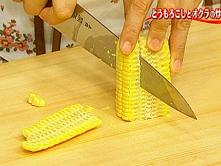 とうもろこしは、長さを半分に切ってから、縦において実を削ぐとよい。 (胚乳はそぎ落としてOK)