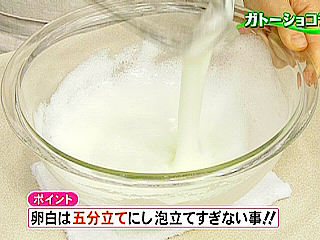 ‘しっとり食感’のカギは卵白、五分立て(角は立てない)にしたものを 生地に加えて、泡をつぶすことが大切です。