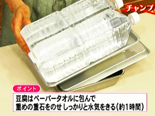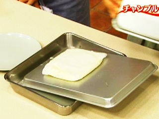 (1)豆腐はペーパーに包んで重石(4kg)をしっかりとのせて1時間おいて水きりする。 途中、ペーパーの水気を絞ること。