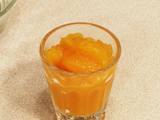 材料:作りやすい分量 オレンジジュース・・・(果汁100%のもの)300ml はちみつ・・・大さじ1~2 粉ゼラチン・・・5g 水・・・大さじ2 作り方 (1)ゼラチンは分量の水にふり入れ、充分にふやかしてから、電子レンジ強(500W)で20秒加熱し溶かしておく。 (2)ボールにジュース、はちみつ、(1)を入れよく混ぜ、バットなどに入れて冷凍庫で30分以上冷やし固める。 (3)フォークでくずしてからグラスに盛る。