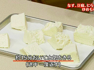 豆腐は大まかに割って、ペーパーの上にのせ、15分位おいて水きりする(時々面を返す)。冷蔵庫には入れないでOK。