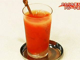 やわらか寒天をフォークで細かく砕いてグラスに入れ、グレープフルーツジュースとトマトジュース各適量、砂糖少々を加えて混ぜる。