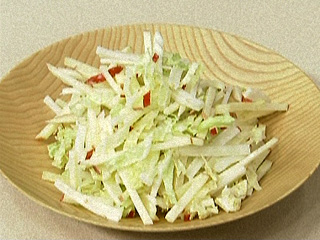 材料:4人分 白菜・・・200g りんご・・・1個 マヨネーズ・・・大さじ3 すり白ごま・・・大さじ1 はちみつ・・・小さじ1 塩・・・小さじ1/3 こしょう・・・少々 作り方 (1)白菜とりんごはせん切りにする。 (2)ボールにマヨネーズ、はちみつ、すりごま、塩、こしょうを加えて混ぜ、(1)を加えてあえる。