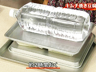 豆腐はペーパーに包んで、重石(2kg)をして2時間ほどおく。