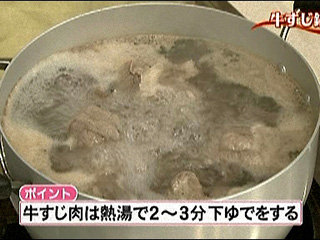 煮る前に牛すじは、下ゆでをして余分なアクや脂を取り除いておくこと。