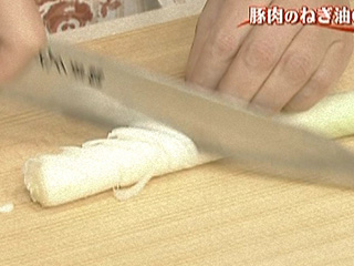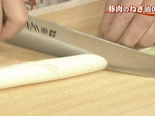 (1)まずは半面に斜めに切り込みを入れていく。このとき庖丁の刃先はまな板につくように、下まで切り落とさないで。