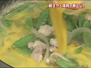 仕上がりが鶏肉と絹さやがバランスよく、卵を流す前に景色を整えましょう!