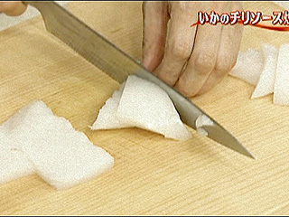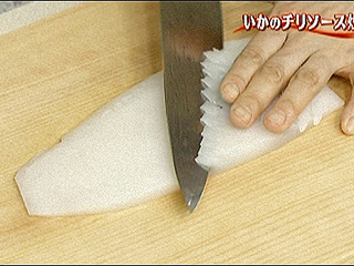 (1)いかを横長におき、包丁を斜めに5ミリ幅で切り込みを入れる。