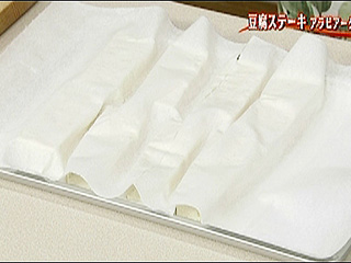 豆腐は切って、ペーパーの上にのせ、上にもかぶせて水きりする。