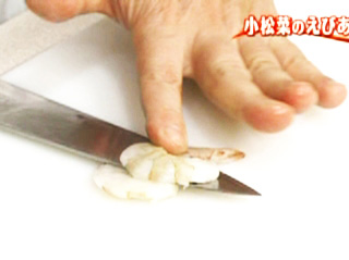 えびは火が通りやすいように縦半分に切る。切ってから背ワタを取り除くとよい。