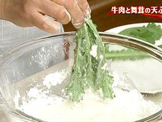 揚げ時間は牛肉約2分、春菊と舞茸は約3分。