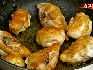 鶏肉のこんがり焼き色具合がうま味になるので、時間をかけて焼くこと。脂ハネ防止にふたをしながら焼くとよい。