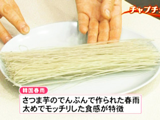 さつま芋でんぷんで作る韓国産の春雨。おなじみの緑豆でんぷんで作る中国春雨より、太く、もちっとした食感が特徴。韓国食品店やネット通販で手に入る。もどし方は商品によってゆでる時間などが異なるので、袋の表示通りにする。