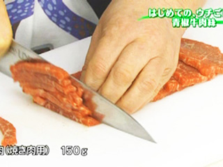 牛肉は、薄切り肉を細切りにしたのでは肉の食感が味わえないので、焼き肉用として売られているちょっと厚切りの肉を細切りにするとよい。