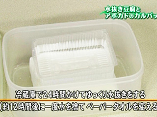 重石は重すぎると豆腐がくずれてしまうので注意。豆腐の入っていたパックに水を入れ、小さなまな板をのせる程度がよく、時間をかけてゆっくり水抜きすることが肝心。