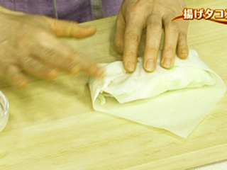 揚げるときは巻き終わりを下にして油に入れます。
