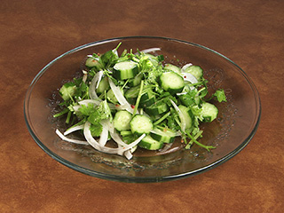 材料4人分 きゅうり…3本 香菜…1わ(30g) 玉ねぎ…1/4個 ▼ソース 酢…大さじ1+1/2 ナンプラー…大さじ1+1/2 水…大さじ1+1/2 砂糖…大さじ1 桜えびのみじん切り…大さじ1 おろしにんにく…小さじ1/4 作り方 (1)きゅうりは皮を縞目にむき、7mm幅の輪切りにする。香菜は3~4cm長さに切る。玉ねぎは薄切りにし、さっと水にさらして水気をしっかりきる。 (2)ボウルにソースの材料を入れて混ぜ合わせ、(1)をあえる。