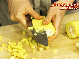 とうもろこしの実をむきとるときは、包丁をりんごの皮むきの要領で動かすと、手早く、きれいにむきとることができる。そのためには包丁で扱いやすい長さに切り分けておくこともポイント。