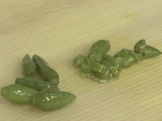 青唐辛子は素手で触らないように、菜箸などでおさえて切るとよい。