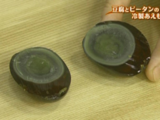 アヒルの卵の加工品。わら灰などのアルカリ性物質と食塩、もみ殻などを混ぜた粘土を卵の殻にぬりつけて熟成させたもの。卵白は黒いゼリー状に、卵黄は暗緑色の層に固まる。写真は食べ頃の状態で真空パックされているもの。殻をむいてから20分ほどおくと、匂いが薄れて食べやすくなる。