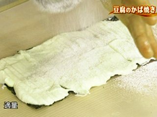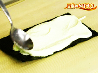 (1)のりの上に、豆腐だねを広げる(水でぬらしたスプーンを使い、平らにする)。