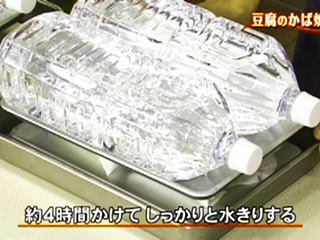 豆腐はペーパータオルに包んでバットに並べ、上にもバットをのせ、水を入れたペットボトル(2リットル)2本をのせ、4時間ほどかけてしっかりと水きりする。 水きりの目安は、豆腐を割って両側から押さえてみて、水分が出てこない状態になればよい。