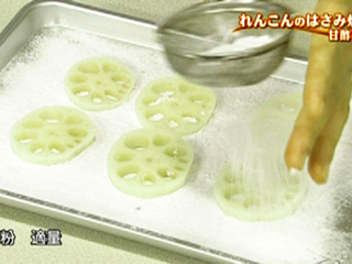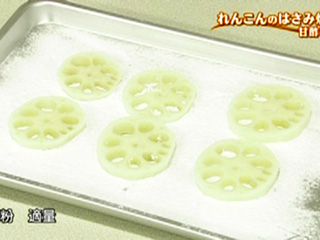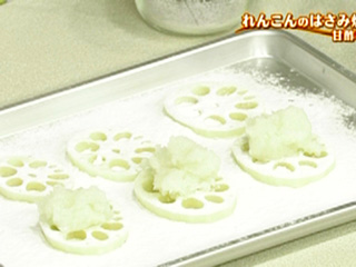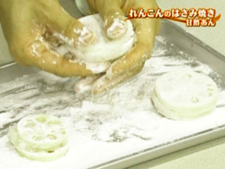 (1)れんこんは切った順に並べ、2枚一組にする。(大きさが違うと挟んだときにバランスが悪くなる)