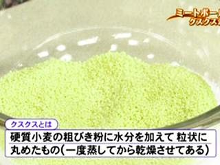 硬質小麦の一種であるデュラム小麦の粗びき粉に水分を含ませ、ごく細かい粒状に丸めて乾燥させ、蒸して再び乾燥させたもの。粒の大きさは大・中・小とあり、一度火を通しているのでふやかすだけでも食べられる。また、その粒をシチューやスープと一緒に食べる料理も総称してクスクスと呼ぶ。