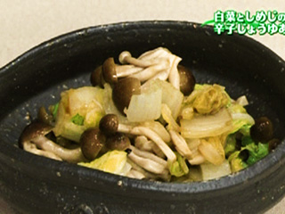 もう一品の辛子じょうゆあえの白菜としめじは、火を通して必ず水気をよく絞ってからあえること(味が薄まらないように)。