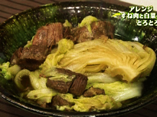 材料4人分 牛すね肉のしょうゆ煮 1/2量 煮汁 1カップ 白菜 1/2株(1.2kg) 作り方 (1)白菜は根元をつけたまま縦に4等分に切る。 (2)厚手の鍋に牛すね肉のしょうゆ煮と煮汁を入れ、上に白菜をかぶせるようにのせ、ふたをして弱めの中火にかけ、白菜がクタクタにやわらかくなるまで40分ほど蒸し煮にする。
