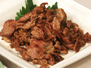 材料:4人分 豚肩ロース肉(薄切り)・・・250g しょうゆ・・・大さじ1+1/2 砂糖・・・大さじ1 酒・・・大さじ1/2 長ねぎのみじん切り・・・1/3本分 おろしにんにく・・・1かけ分 おろししょうが・・・1かけ分 すり白ごま・・・大さじ1/2 ごま油・・・大さじ1/2 作り方 (1)豚肉に調味料とねぎ、しょうが、にんにく、ごま、ごま油を順にもみ込む。 (2)フライパンでさっと焼く。