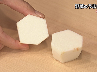 (5)反対側も同様に2角にむく。これで六方、亀甲の形に。