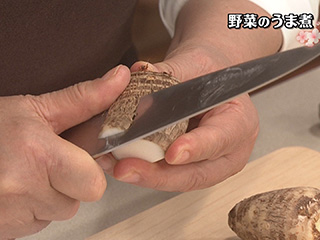 味に変化がつくように、白いもの(里芋、れんこん、たけのこ、にんじん)は白く、黒いもの(椎茸、こんにゃく)はちょっと濃いめに黒く煮上げます。