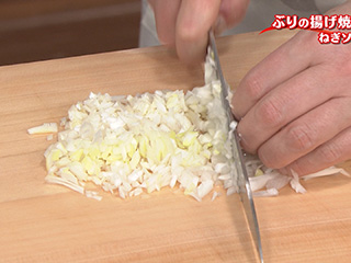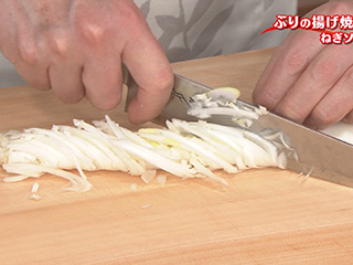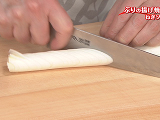 (3)小口に刻む。ねぎから水気が出ず、ふわっとする。