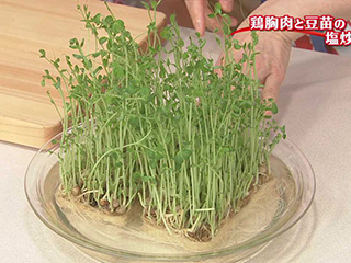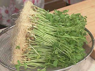 豆苗は根を切り落としてから水にさっとつけて洗い、水気をきっておく。