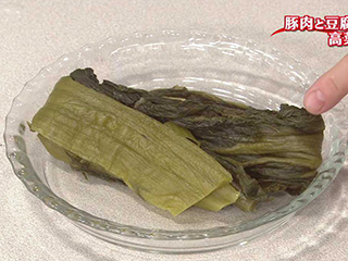 高菜はもみ洗いをした後、必ず味見をして塩加減を確認すること(ここで塩辛いと感じたらさらにもみ洗いをする。ここで洗いすぎるとうま味が抜けてしまうので注意)。