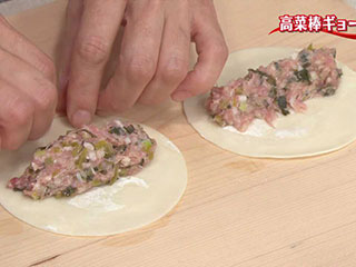 皮の縁に水をぬり、肉だねを横に棒状になるようにのせ、手前の皮を持ち上げてくるりとひと巻きする。肉だねが皮の両端1cmほど内側に収まるようにする。