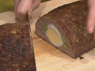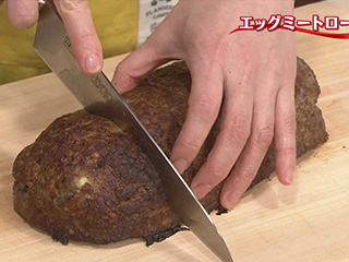 (1)切り口が卵の黄色が出るように、まず真ん中から半分に切る。