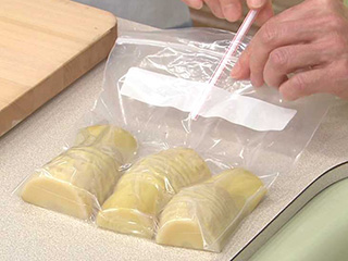 新たけのこは多めにゆでた場合は、保存袋に入れてストローなどで利用して、空気を抜いて冷蔵保存するとよい。