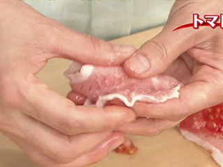 トマトが見えていると、揚げ焼きにしたときにトマトの汁が出てしまうので、なるべくトマトが見えないように豚肉を巻きつける。