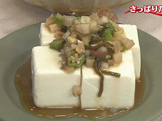 食べやすく切った豆腐に、“だし”をたっぷりかける。みょうが、しょうがの薬味野菜入りで、れんこんやオクラの歯ごたえがよく、冷ややっこがちょっとごちそうに。