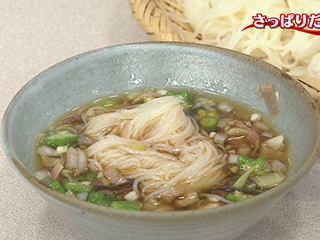 そうめんは熱湯でゆで、流水で洗って氷水で冷やし、水気をきって器に盛る。“だし”適量を添えて、そうめんをつけて食べる。つるつるとのどごしがよく、さっぱりと食べられる。