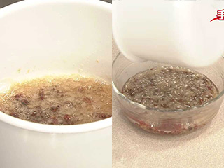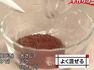 作り方 (1) 耐熱ボウルに粉唐辛子と粉山椒を入れて混ぜ、分量の水を加えてふやかし、混ぜる。